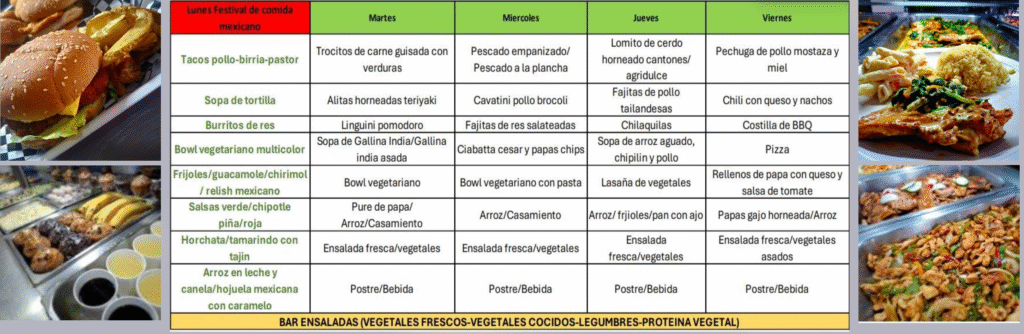 Ofrecemos menús mensuales con anticipación para su aprobación, permitiendo sugerencias y adaptaciones a medida.